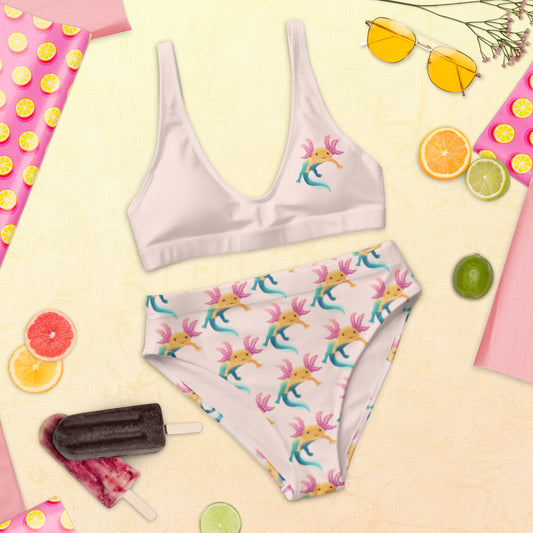 Bikini med hög midja i återvunnet material. Vit med axolotlen Axis tryck. Storlek XS-3XL