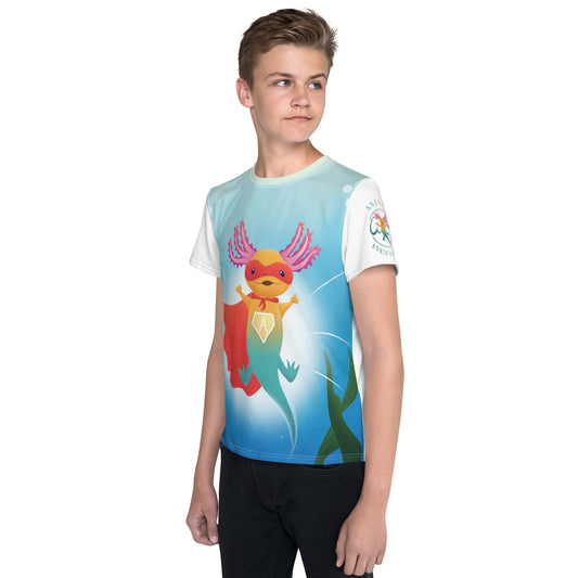 "SuperAxis" T-shirt för barn/ungdom 8-18 år, med helt tryck på framsidan samt rundad hals, vit rygg och ärm.